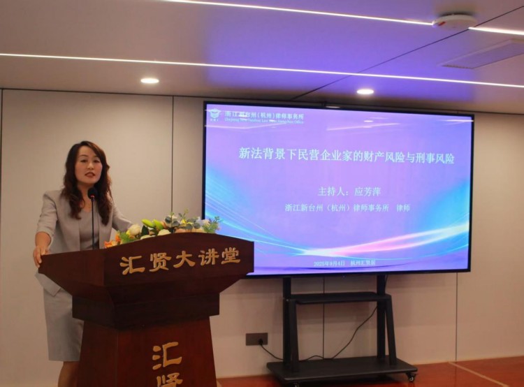 现场图 搭建专业交流平台助力企业法治建设 活动伊始,主持人、浙江新台州(杭州)律师事务所应芳萍律师代表浙江新台州律师事务所对与会嘉宾表示热烈欢迎。她在开场介绍中指出,随着中央民营经济保护政策的落地实施,《公司法》修订出台、《刑法》体系持续完善及民营企业促进政策的陆续发布,民营企业家既迎来前所未有的机遇,也面临着更加复杂的法律环境。应律师表示企业家作为企业实际控制人、董事、监事及高级管理人员,身兼多重身份,承担着更加严格的法律责任,财产风险与刑事风险防范显得尤为重要。本次沙龙正是新台州律师事务所发挥专业所长,履行公益职责,助力营商环境法治建设的重要举措。