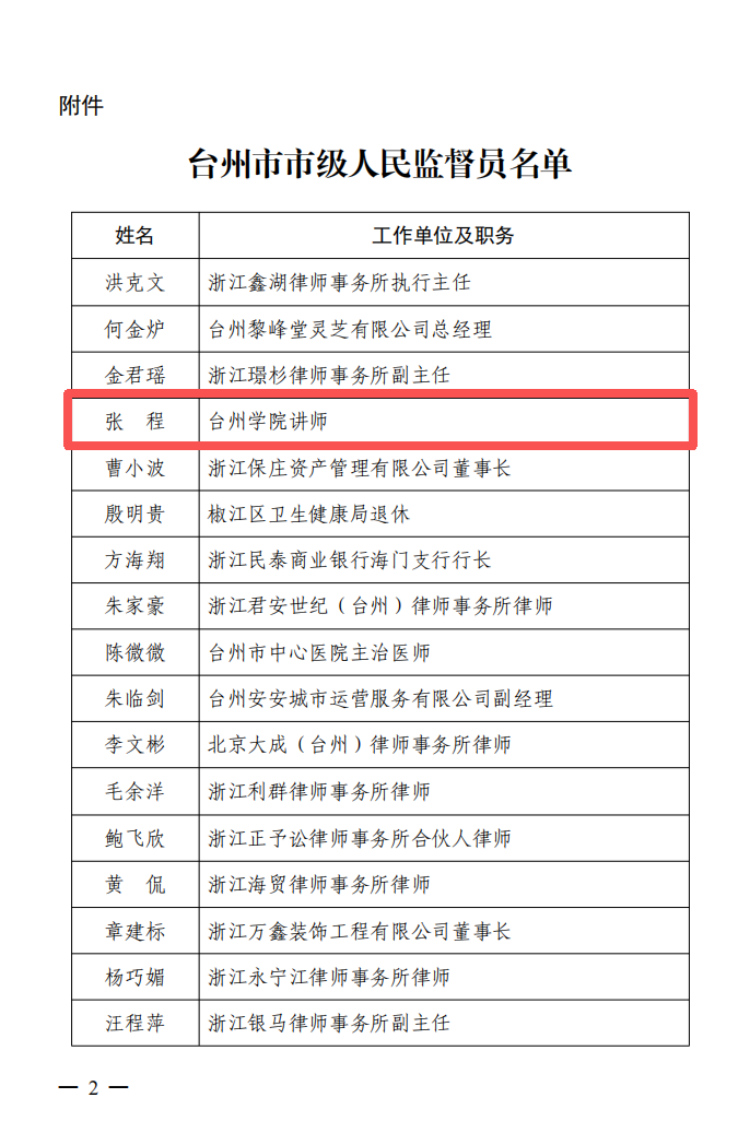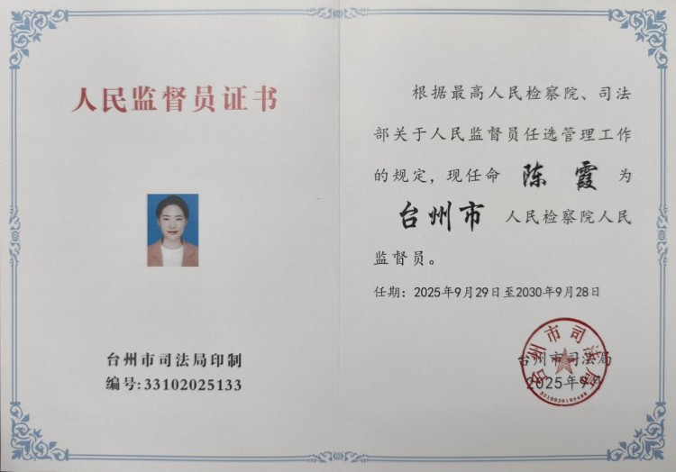 近日,按照《人民监督员选任管理办法》的具体要求,台州市司法局历经严格遴选与逐级审核等环节,最终确定并公示了新一届市级人民监督员的名单。浙江新台州律师事务所张程律师、陈霞律师获任台州市市级人民监督员(台州市人民检察院人民监督员),任期自2025年9月29日至2030年9月28日。