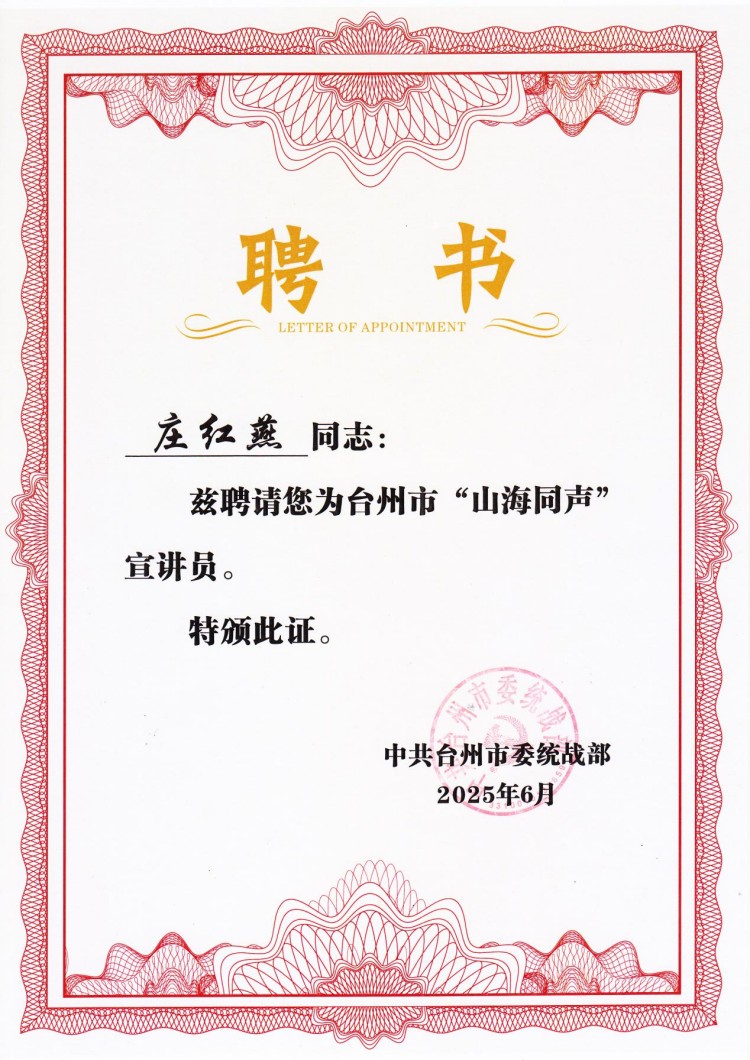 2025年6月,浙江新台州律师事务所庄红燕律师被中共台州市委统战部聘请为台州市“山海同声”宣讲员。