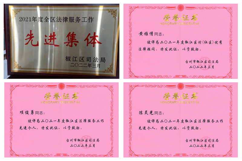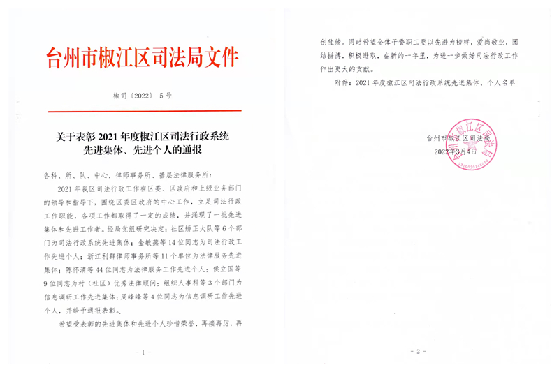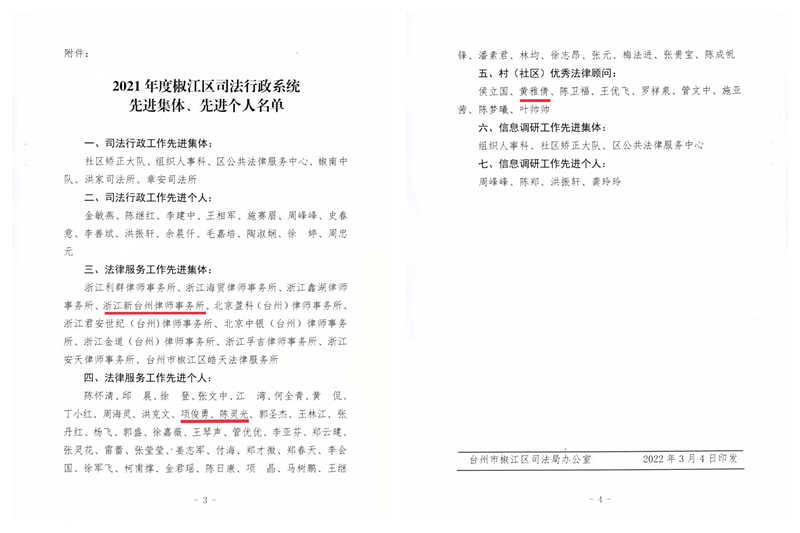 近日,椒江区司法局下发《关于表彰2021年度椒江区司法行政系统先进集体、先进个人的通报》,对2021年度椒江区司法行政系统先进集体和先进个人进行表彰。浙江新台州律师事务所荣获“法律服务工作先进集体”。 本所项俊勇律师、陈灵光律师入选“法律服务工作先进个人”,黄雅倩律师入选“村(社区)优秀法律顾问”。(名单附后) |