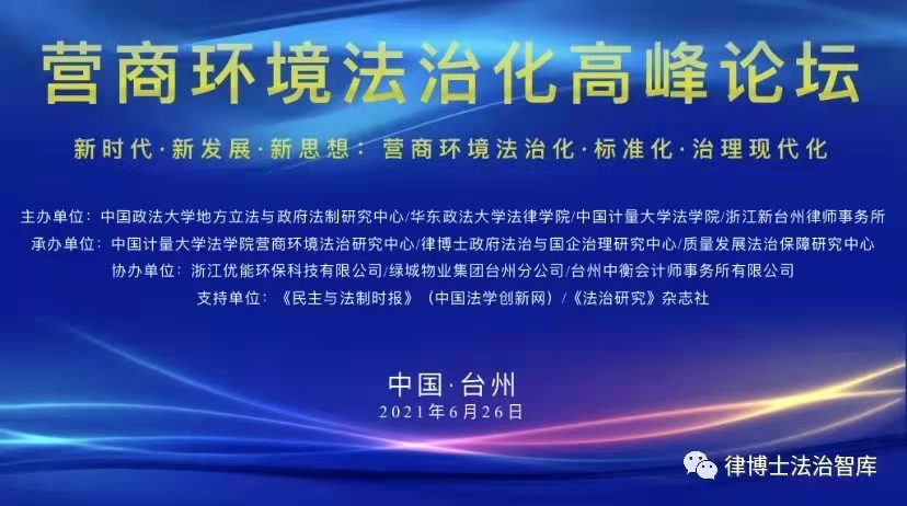 2021年6月26日,“营商环境法治化高峰论坛(2021)”在浙江台州举行。主题为“新时代·新发展·新思想:营商环境法治化、标准化与治理现代化”。 论坛由中国政法大学地方立法与政府法制研究中心、华东政法大学法律学院、中国计量大学法学院和浙江新台州律师事务所等单位联合主办,来自国家司法部、国家市场监督管理总局、全国各地各级政法机关与研究机构、实务单位,以及北京大学、中国人民大学、中国政法大学、华东政法大学、海南大学、中国计量大学等二十余所高校的代表与专家参加了论坛。 |