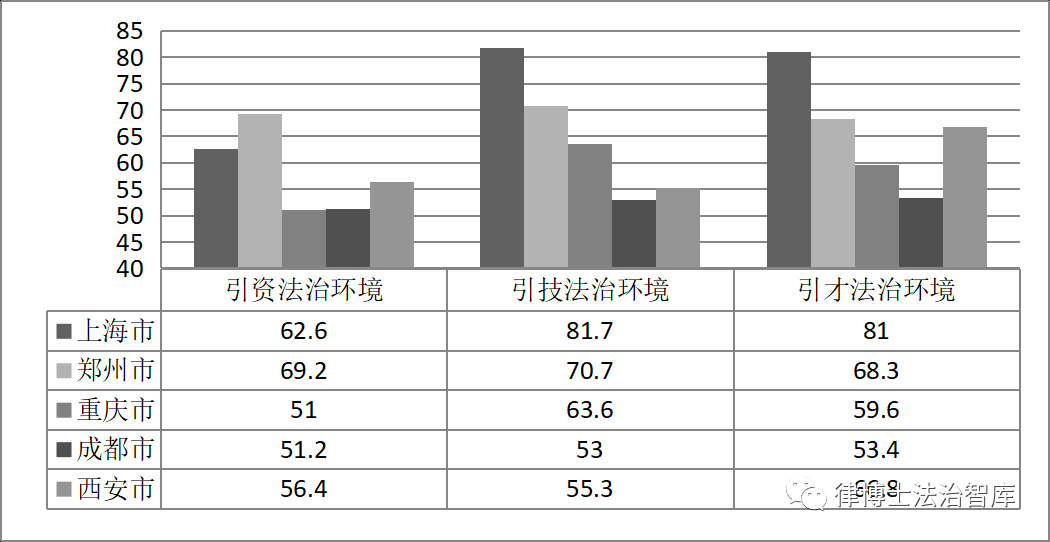 根据测评结果分析,上海市表现突出。上海市除了在传统的吸引投资制度环境上优势不太明显外,在引进技术和引进人才制度环境上表现远远高于其他城市。仅次于上海市的是郑州市,西部的重庆、成都和西安三个城市总的得分基本相当,但是他们各有自己的强项和弱项。如图所示,因为在2018年到2019年颁布了大量的新的人才引进制度,西安市在人才引进法治环境上表现较为突出,而重庆市则在技术引进法治环境上表现突出。